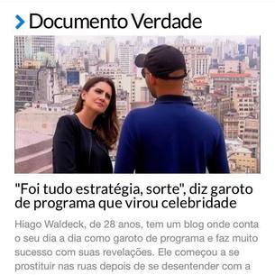 Hiago Waldeck, de 28 anos, tem um blog onde conta o seu dia a dia como garoto de programa e faz muito sucesso com suas revelações. Ele começou a se prostituir nas ruas depois de se desentender com a família e conta que, no auge da profissão, chegou a ganhar R$ 40 mil por mês.