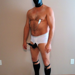 I love wearing sock garters with black dress socks and loafers. Tighty whities briefs are a great item to wear too along with my thick rubber cock and ball sheath.